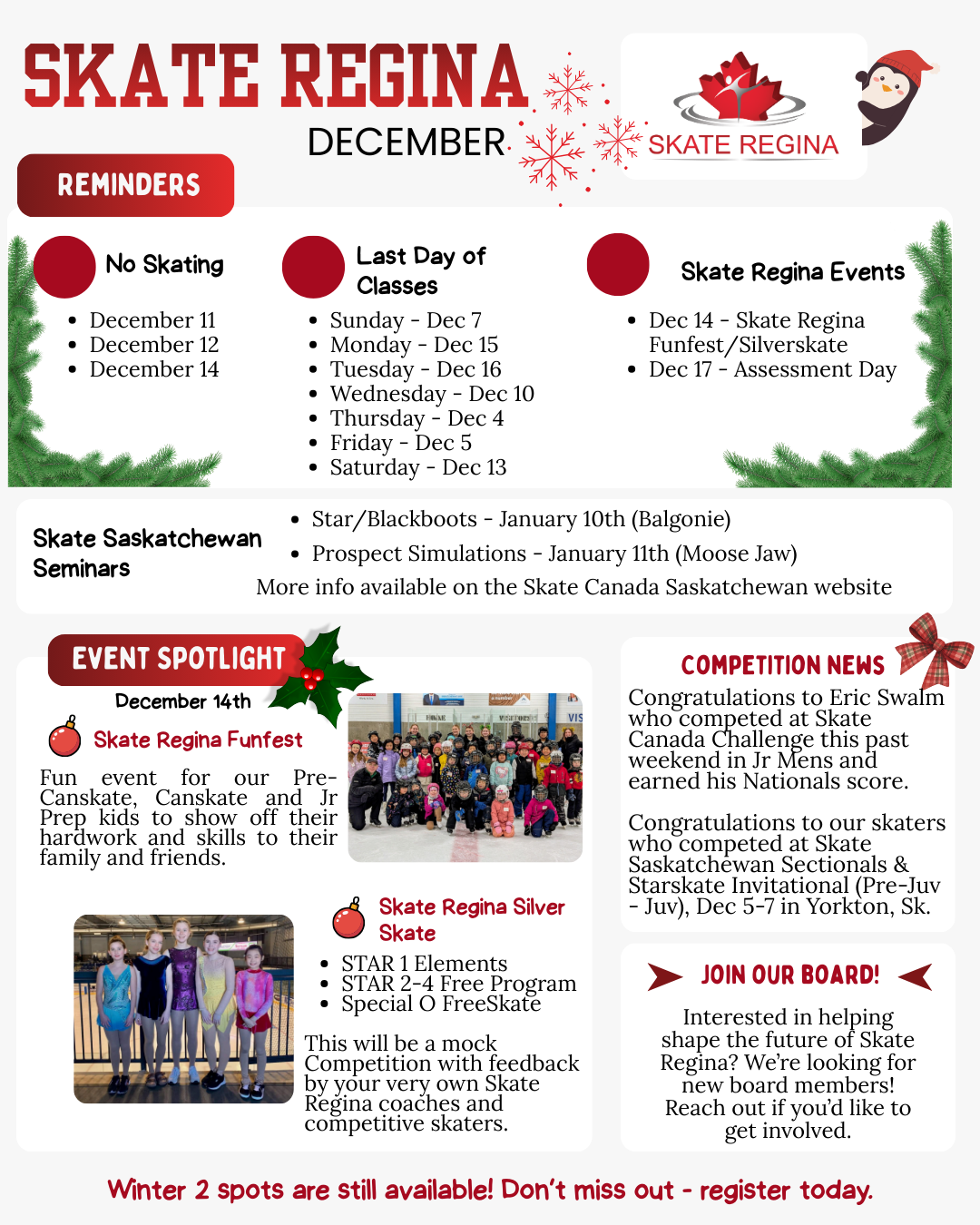 Mark your calendars for December 14th, 12:30-3:30! Skate Regina is excited to host our annual Skate Regina Funfest and Skate Regina SilverSkate Competition.